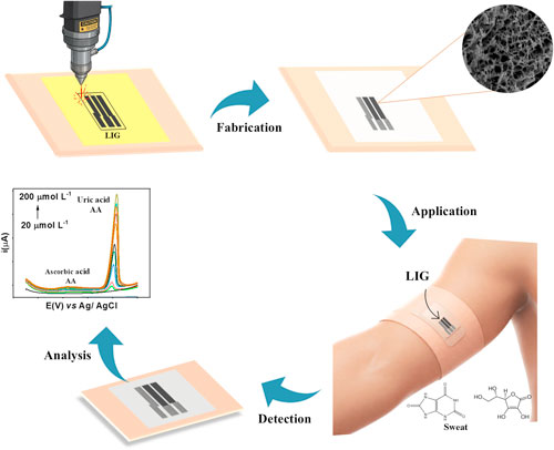 As demand grows for non-invasive, real-time health monitoring, sweat has emerged as a valuable biofluid for tracking physiological biomarkers. In this study, researchers developed a flexible sensing platform using laser-induced graphene (LIG), a porous, conductive material created through laser processing, and transferred it onto a commercial adhesive bandage. The result is a lightweight, skin-conformal sensor capable of detecting key metabolites directly from sweat.