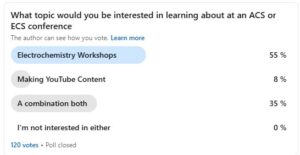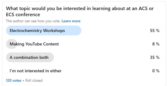 I attended the electrochemical education symposium at the 248th ECS Meeting in Chicago, IL. After listening to the talks, I was inspired to develop an abstract to present at a future meeting. The topic would either be about my efforts in teaching electrochemistry via YouTube or developing electrochemistry workshops. Not knowing which topic to pick, I decided to poll my LinkedIn network. To my surprise, only eight percent of people were interested in learning about making YouTube content, compared to 55 percent who were interested in electrochemistry workshops.