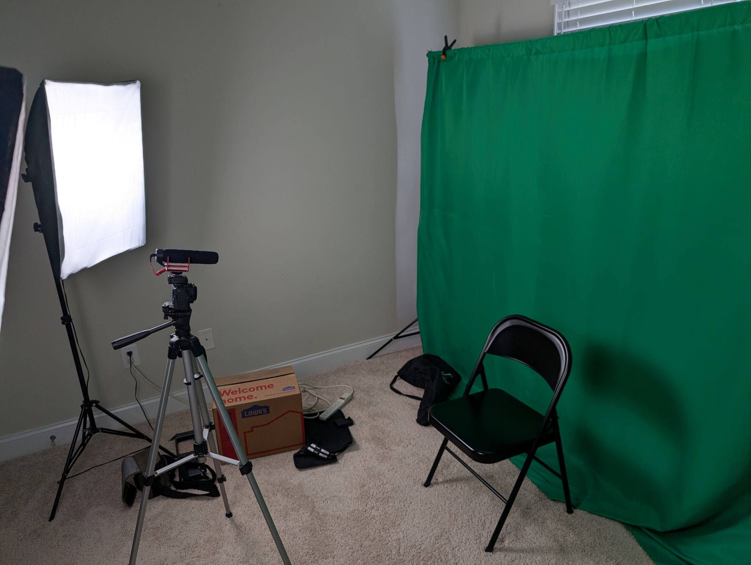 - You don’t need fancy equipment: The setup I used for a long time was nothing fancy, just a green screen, Digital Single-Lens Reflex (DSLR) camera with a good lens, a chair, and some lights. To consult my script between takes, I placed my laptop on an old box! While I’ve used a DSLR camera for years, smartphone cameras are more than adequate for making professional-looking videos. The important thing is lighting. A few lights in the right places significantly enhance your video quality, regardless of the camera used. Thankfully, lights are fairly inexpensive.